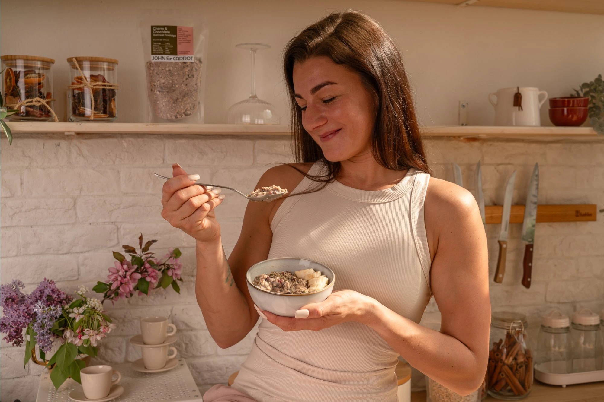 Jogurt nebo rostlinná alternativa + granola John & Carrot + ovoce → kombinace komplexních sacharidů, zdravých tuků a mikronutrientů.