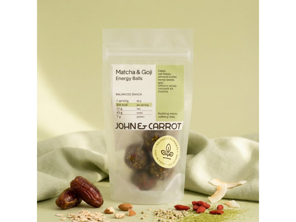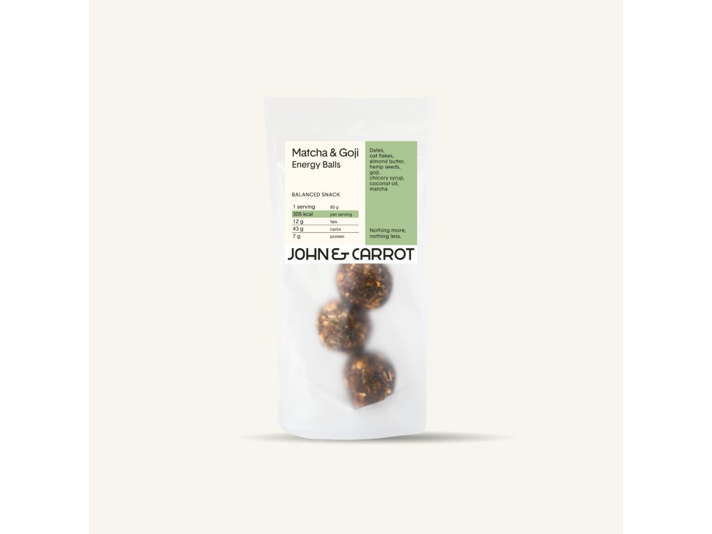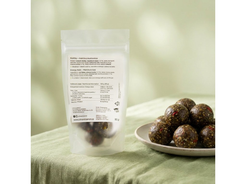 Spojení jemného mandlového másla, matchy a goji bobulí vytváří chuť, která osvěží a povzbudí v každém soustu. Tyto raw kuličky jsou přirozeně slazené čekankovým sirupem, bez přidaného cukru, a přinášejí 7 g rostlinného proteinu na jedno balení.