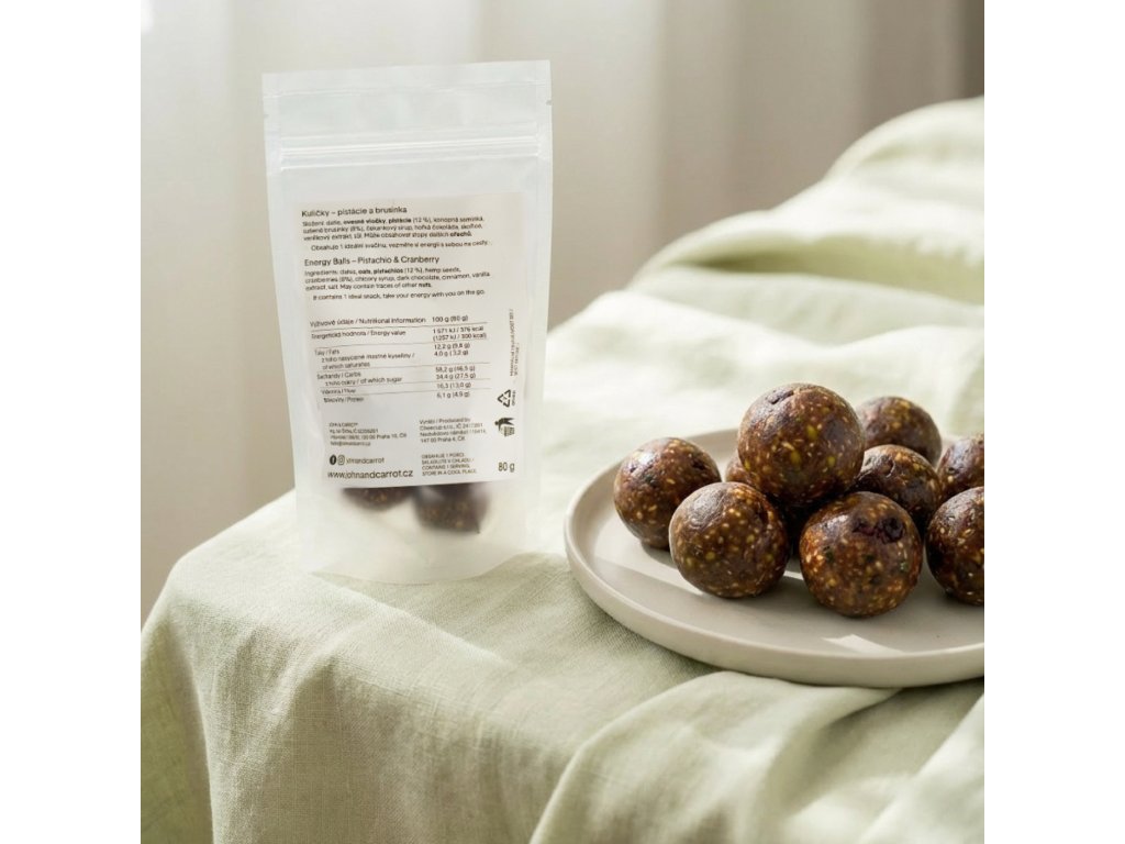 Vyvážená kombinace pistácií, brusinek a ovsa proměněná v malé kuličky, které ti dodají energii kdykoliv během dne. Bez přidaného cukru, slazené jen čekankovým sirupem a ovocem, představují přirozený zdroj vlákniny a rostlinných živin.