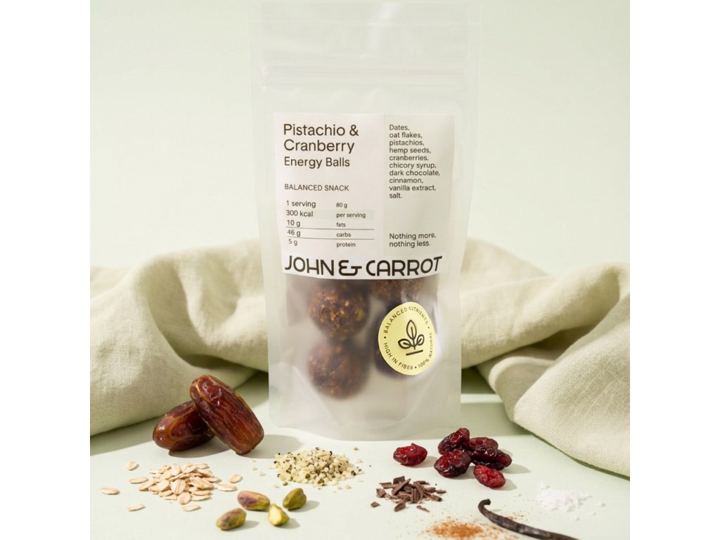 Raw kuličky plné energie — pistácie, brusinky a čistá síla přírody.